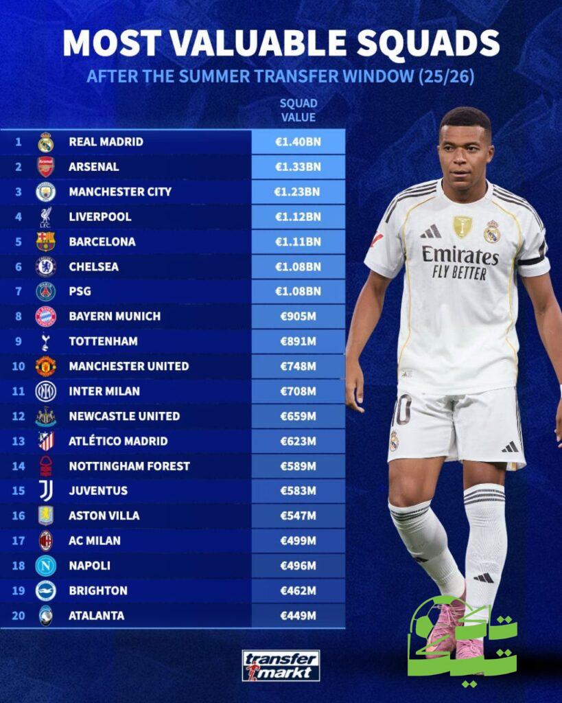 القائمة شملت أغلى 20 فريقًا في العالم، حيث جاء خلف ريال مدريد أندية الصفوة الأوروبية التي تنافس على المراتب الأولى في سوق كرة القدم العالمي. هذا التصنيف يعكس مدى قوة الفريق الملكي على المستوى الاقتصادي والرياضي معًا، خاصة وأن قيمته ارتفعت بشكل ملحوظ في ظل قدوم صفقات جديدة وبقاء أعمدته الأساسية.