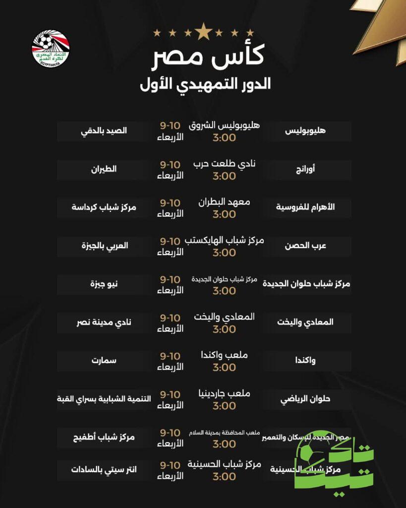 وستُقام مباريات هذا الدور يوم الأربعاء 10 سبتمبر الجاري في تمام الثالثة عصرًا، على أن تُستكمل جولتان منها يوم الخميس 11 سبتمبر في نفس الموعد. ويشارك في هذه المرحلة عدد كبير من أندية الدرجة الثانية والثالثة وأندية الشركات والمراكز الشبابية، في بداية المشوار الطويل الذي قد يقود بعضها لمواجهة فرق الدوري الممتاز لاحقًا.