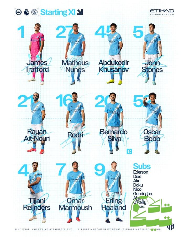 التشكيلة تعكس رغبة غوارديولا في المزج بين القوة الدفاعية والسرعة الهجومية، مع منح الفرصة للمصري عمر مرموش للظهور منذ البداية بجوار النرويجي إيرلينغ هالاند، في ثنائي هجومي مثير قد يشكل صداعًا لدفاع برايتون. كما يبرز وجود ترافورد في المرمى بدلًا من إديرسون، وهو قرار قد يثير الكثير من النقاش بين جماهير السماوي.