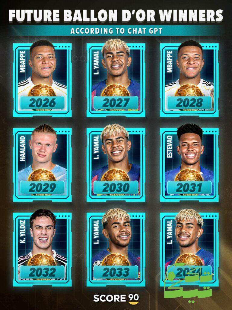 وفقا لتوقعات الذكاء الاصطناعي فان لامين يامال سيتوج بالكرة الذهبية 4 مرات في غضون الاعوام التسعة بين 2026 و حتى 2034.