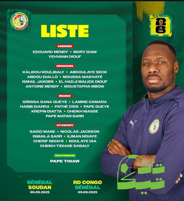 تاكتيكا — أعلن باب ثياو، المدير الفني للمنتخب السنغالي، عن القائمة الرسمية التي ستخوض مباراتي السودان وتوغو ضمن التصفيات الإفريقية المؤهلة إلى كأس العالم 2026.
