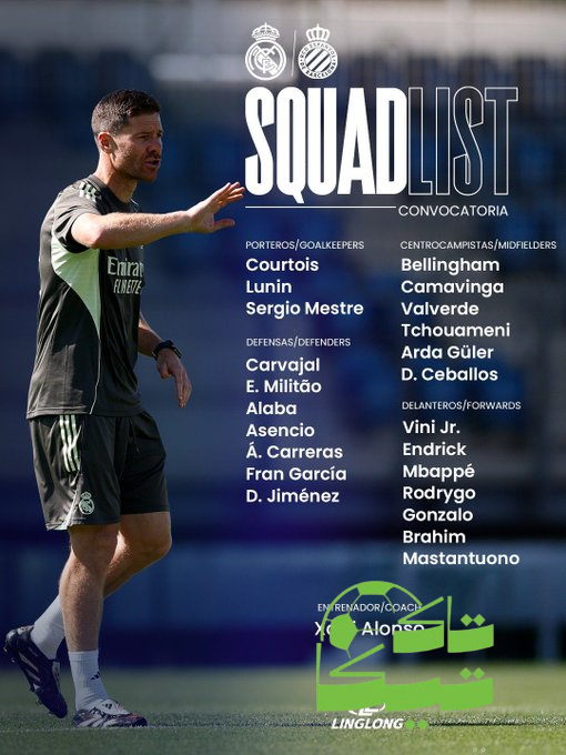 تاكتيكا — أعلن الجهاز الفني لنادي ريال مدريد بقيادة المدرب تشابي ألونسو قائمة اللاعبين المستدعاة لمواجهة إسبانيول في الدوري الإسباني.