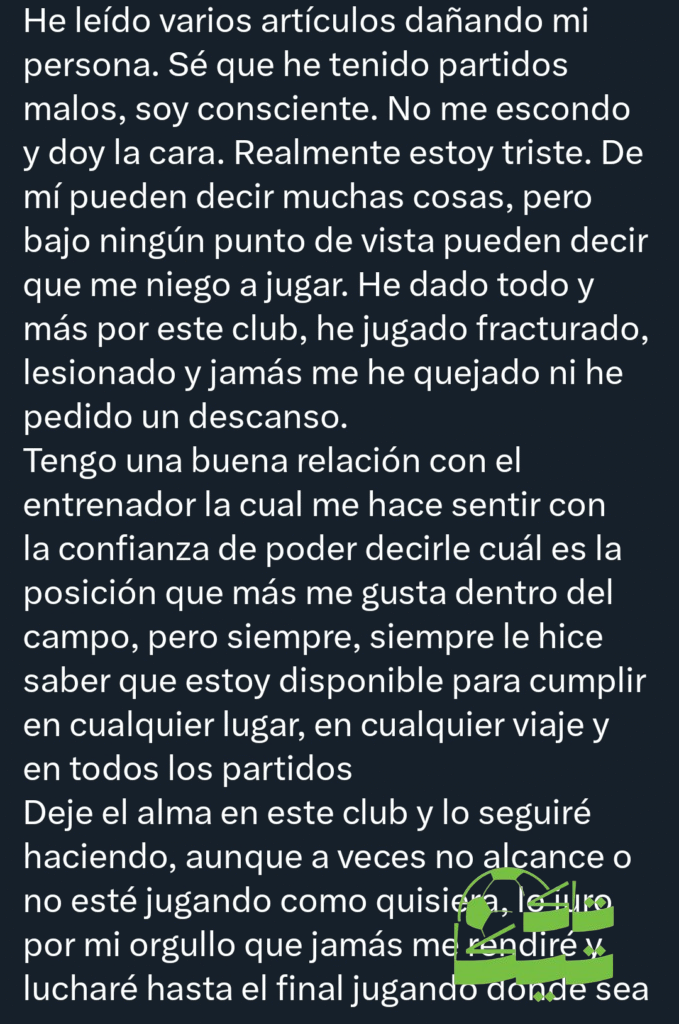 وختم برسالة عاطفية للجماهير: “لقد تركتُ قلبي وروحي لهذا النادي، وسأواصل ذلك، حتى لو لم يكن ذلك كافيًا أحيانًا أو لم ألعب كما أريد. أقسم بفخري أنني لن أستسلم أبدًا، وسأقاتل حتى النهاية، سألعب أينما احتاجني.”