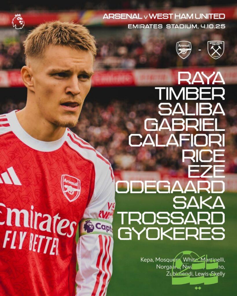 تاكتيكا تاكتيكا — أعلن نادي أرسنال عن التشكيلة الرسمية التي ستخوض مواجهة ويستهام يونايتد، ضمن منافسات الدوري الإنجليزي الممتاز، في المباراة التي تُقام في تمام الساعة الخامسة مساءً على ملعب الإمارات.