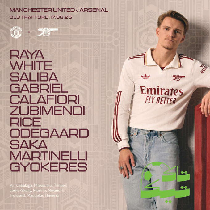 تاكتيكا– أعلن ميكيل أرتيتا، مدرب أرسنال، عن التشكيلة الرسمية لفريقه لمواجهة مانشستر يونايتد المقررة الليلة.