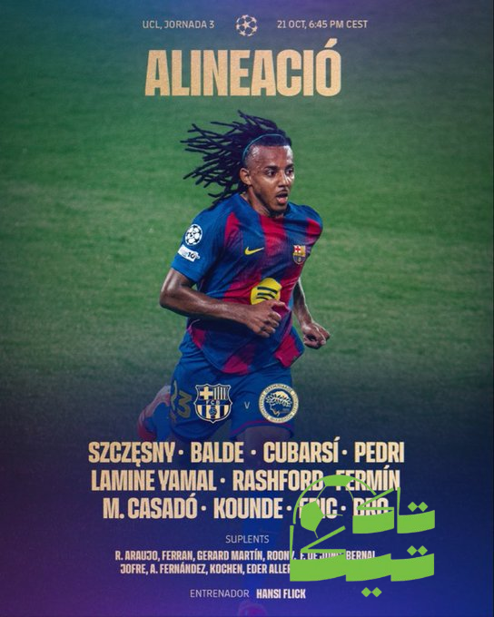 تاكتيكا — أعلن نادي برشلونة الإسباني عن التشكيلة الأساسية التي سيخوض بها مواجهة الجولة الثالثة من دور المجموعات في دوري أبطال أوروبا، المقررة مساء اليوم الأحد 21 أكتوبر في تمام الساعة 6:45 بتوقيت وسط أوروبا.