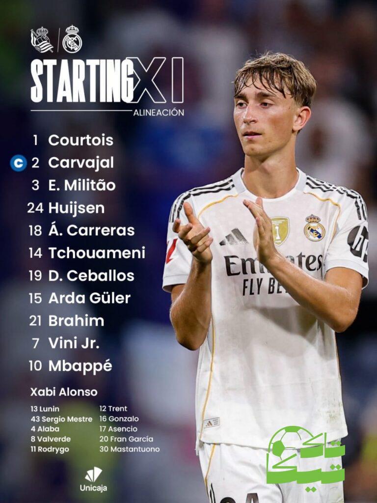 التشكيلة تُظهر مزيجًا بين العناصر الأساسية والخيارات الشابة، حيث يواصل الونسو الاعتماد على كاريراس في الجهة اليسرى بجانب مشاركة هويجسن في قلب الدفاع، بينما يأتي الثلاثي الهجومي مبابي وفينيسيوس وبراهيم كقوة ضاربة أمام دفاعات سوسيداد.