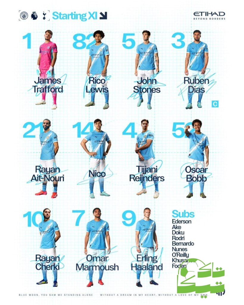 تاكتيكا — أعلن نادي مانشستر سيتي عن تشكيلته الأساسية لمواجهة توتنهام هوتسبير في الجولة الجديدة من الدوري الإنجليزي الممتاز، في المباراة التي تنطلق عند الساعة 2:30 ظهرًا مكة المكرمة على ملعب الاتحاد.