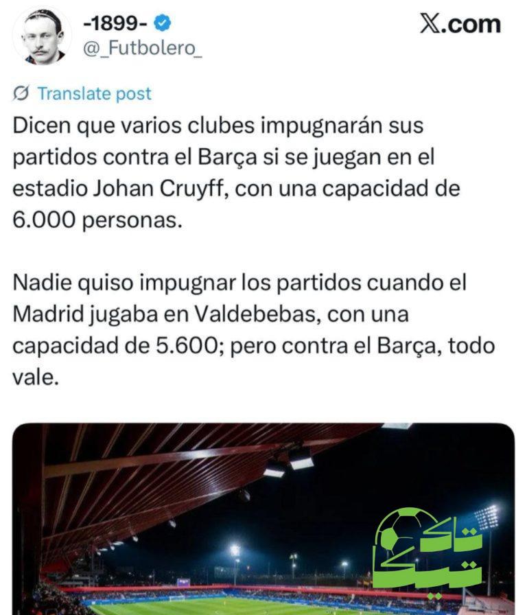 تاكتيكا– أثار أحد الحسابات الإسبانية جدلًا بعد إشارته إلى أن بعض الأندية قد تطعن في نتائج مبارياتها ضد برشلونة إذا أقيمت على ملعب يوهان كرويف، بسعة 6000 مشجع، معتبرًا أن ذلك لم يحدث عندما خاض ريال مدريد مبارياته في فالديباس، الذي يتسع لـ5600 متفرج.