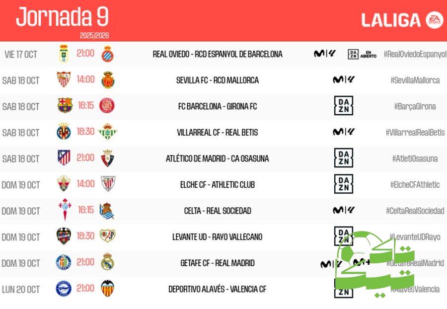 تاكتيكا– أعلنت رابطة الدوري الإسباني، مساء اليوم الخميس، عن مواعيد مباريات الجولة التاسعة من منافسات الليغا لموسم 2025-2026.