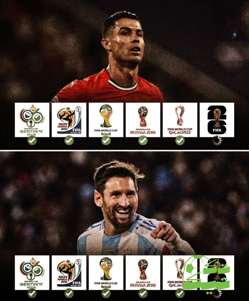 ميسي و رونالدو شارك مع الارجنتين و البرتغال في نهائيات المونديال منذ دورة المانيا 2006 و حتى دورة قطر 2022.