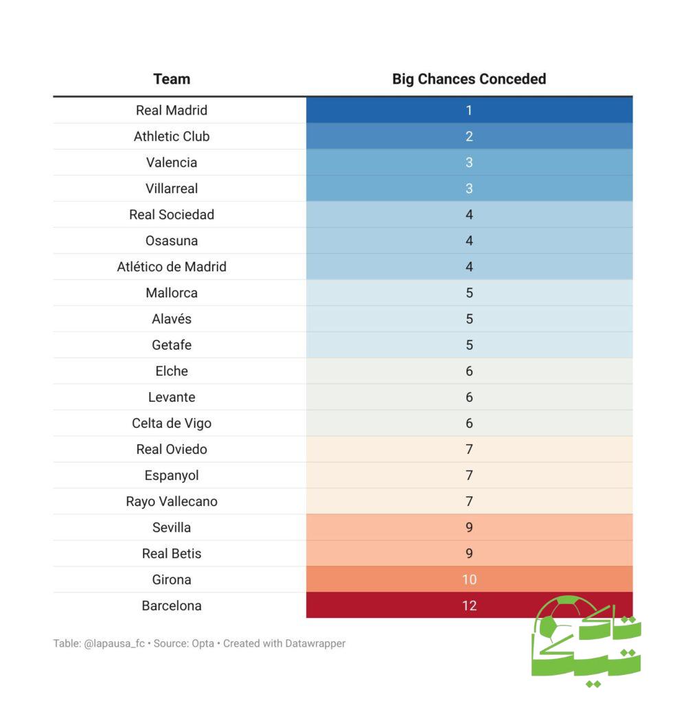 وفي المقابل، ظهر برشلونة بصورة مقلقة، إذ استقبل دفاعه 12 فرصة محققة، ما يجعله الفريق الأكثر هشاشة في البطولة حتى الآن.