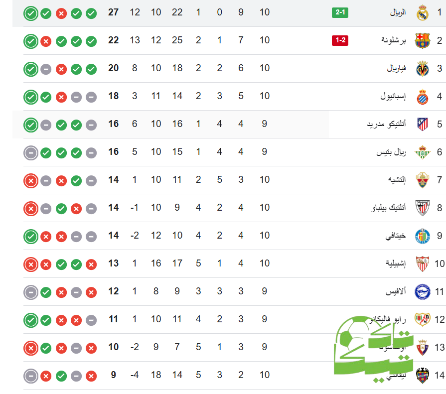 وبهذا الانتصار، عزز ريال مدريد صدارته لجدول ترتيب الدوري الإسباني برصيد 27 نقطة، بينما تجمّد رصيد برشلونة عند 22 نقطة في المركز الثاني.