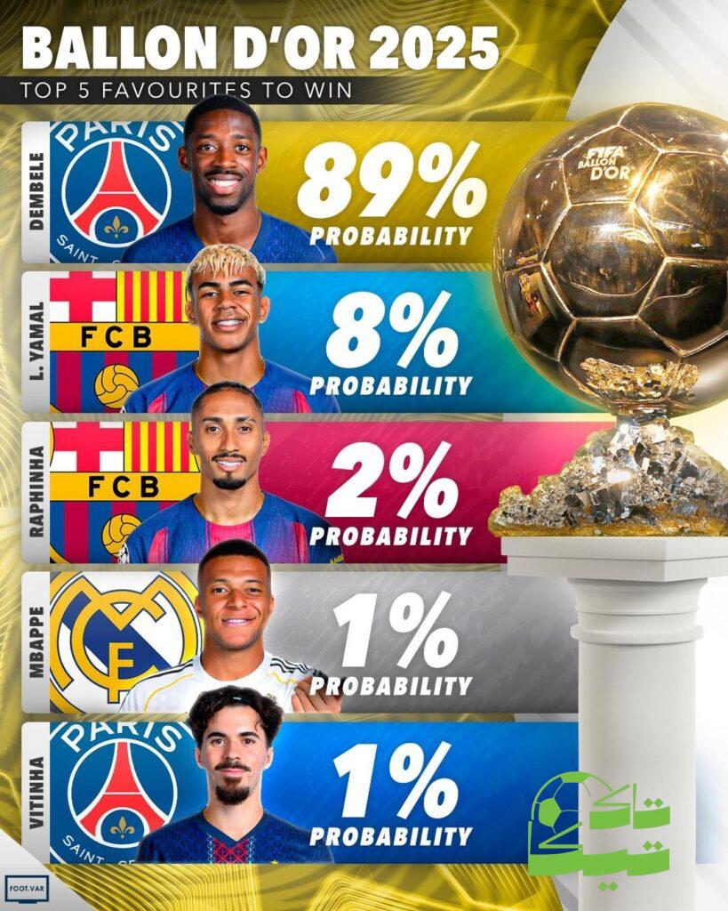 تاكتيكا– نشر موقع سكور 90 اخر تحديث لسباق جائزة الكرة الذهبية نسخة العام 2025 قبل الاعلان رسميا عن الفائز بها غدا الاثنين من قبل مجلة فرانس فوتبول .