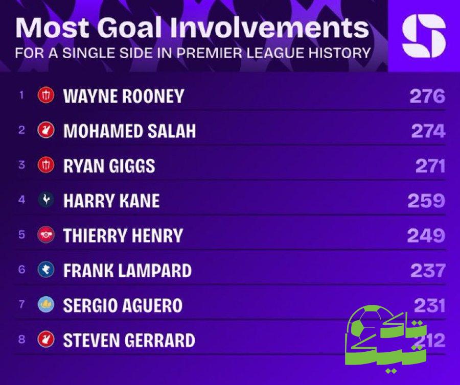 الإحصائية تكشف أن روني يتصدر القائمة بـ276 مساهمة مع مانشستر يونايتد، فيما يقف صلاح خلفه مباشرة بـ274 مساهمة بقميص ليفربول، متفوقًا بالفعل على أساطير كبار مثل رايان غيغز (271) وتييري هنري (249).