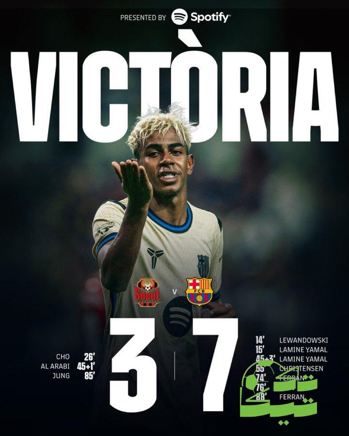 الفريق الكتالوني قدّم عرضًا هجوميًا ممتعًا، شهد تألقًا لافتًا من النجم الشاب لامين يامال الذي سجّل هدفين وقدم تمريرة مؤثرة في هدف ثالث، بينما افتتح روبرت ليفاندوفسكي التسجيل بعد متابعته لتسديدة يامال، وأضاف كل من أندرياس كريستنسن وفيران توريس (هدفين)، بالإضافة إلى لمسة حاسمة من ماركوس راشفورد في ظهوره الأول بقميص البلوغرانا.