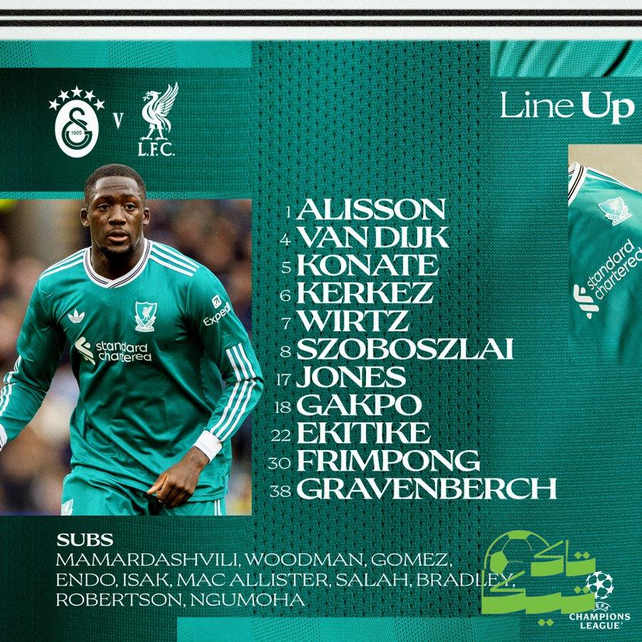 تاكتيكا– أعلن ارني سلوت ، مدرب ليفربول، عن تشكيلة ليفربول الرسمية ضد غلطة سراي ، مساء اليوم الثلاثاء، في الجولة الثانية من مرحلة المجموعات ببطولة دوري ابطال اوروبا .
