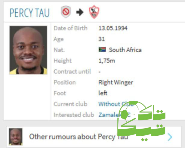 تاكتيكا– أشار موقع “ترانسفير ماركت” العالمي إلى اقتراب النجم الجنوب أفريقي بيرسي تاو لاعب الأهلي السابق من الانتقال إلى نادي الزمالك، وذلك بنسبة تصل إلى 99%، بعد انتهاء عقده رسميًا مع نادي قطر القطري.
