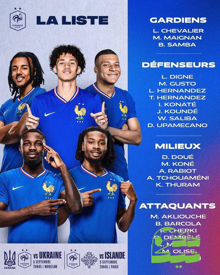 تاكتيكا — أعلن ديديه ديشامب، المدير الفني لمنتخب فرنسا، عن قائمته الرسمية لمباراتي أوكرانيا وآيسلندا في التصفيات، والتي شهدت استدعاء المدافع جول كوندي لاعب برشلونة ضمن خط الدفاع.
